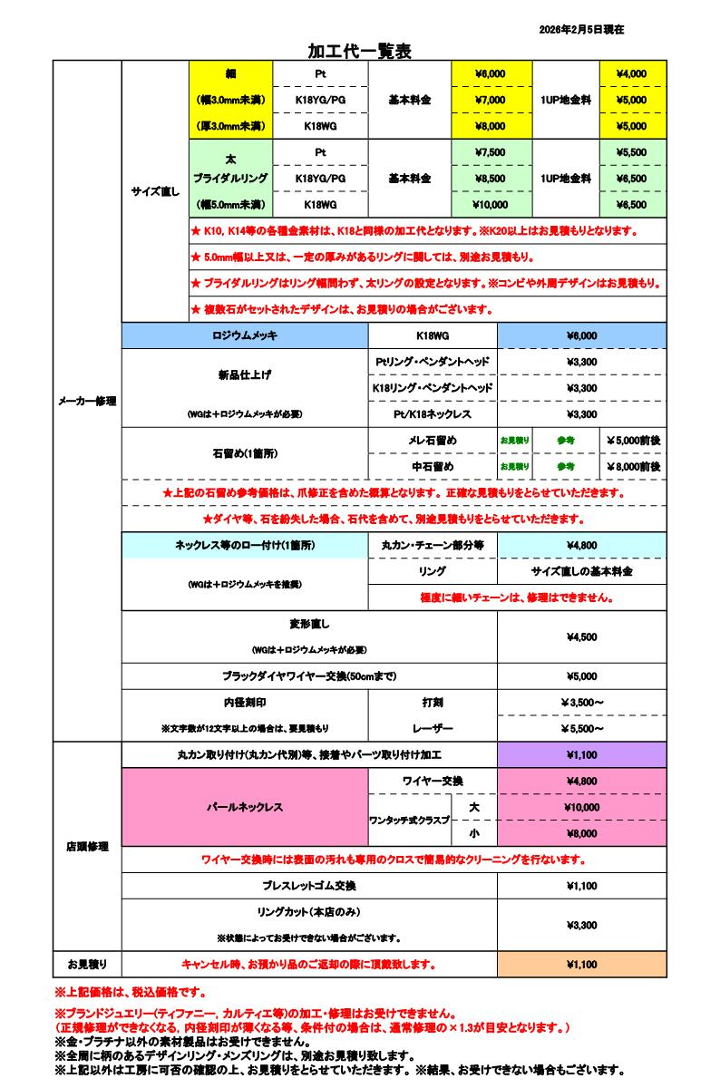 ※ブライダルリングのサイズ直しはリング幅を問わず、幅太のリングのサイズ直し料金を適用させていただきます。ただし、弊社取り扱いのブライダルブランドでの加工修理の場合は、ブランドの修理加工料金に準じます。