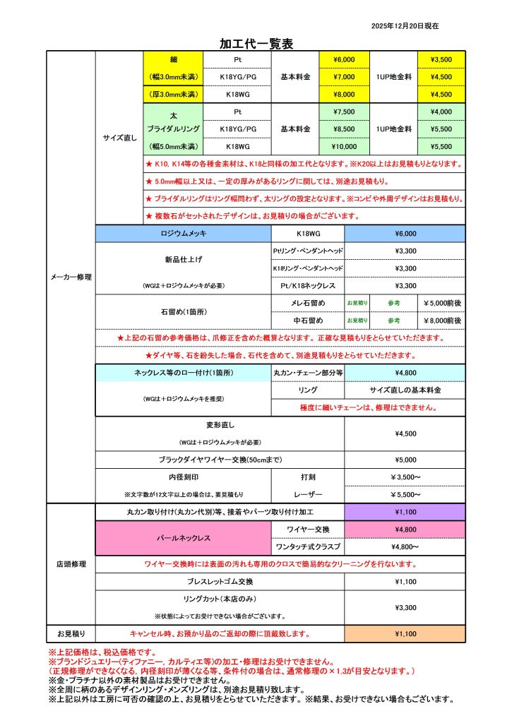 基本的にリング幅・厚みに対応した地金素材の基本料金にて加工を承ります。